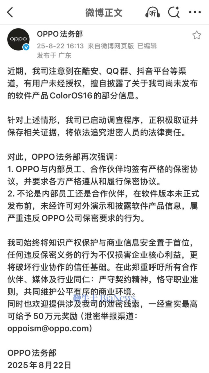 OPPO法务部还称,同时也欢迎提供涉及公司的泄密线索,一经查实最高可给予50万元奖励。