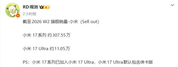 【CNMO科技消息】1月18日,数码博主“RD观测”称,截至2026年第2周,小米17系列销量达约307.55万台。其中,17 Ultra销量约为11.05万台。