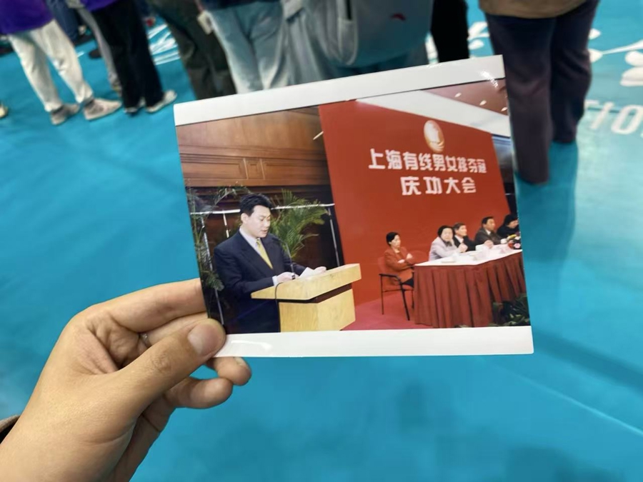 老照片里,时任上海女排主教练蔡斌在庆功大会上发言