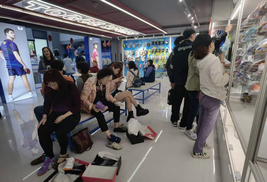 嘉年华的热度,直接转化为实实在在的消费活力。记者了解到,自乒乓球嘉年华启动以来,到店咨询、体验、选购的市民络绎不绝,球拍、套胶、专业乒乓鞋服等品类需求一路走高,其中入门级球拍和高性价比国产鞋服,成了近期最受追捧的“明星单品”。数据最有说服力:门店日均销量较去年同期提升约35%,周末客流量更是翻了一番,门店每天接待顾客上百人,热闹的人气里,藏着国球运动的深厚底蕴,更藏着体育消费的强劲动力。